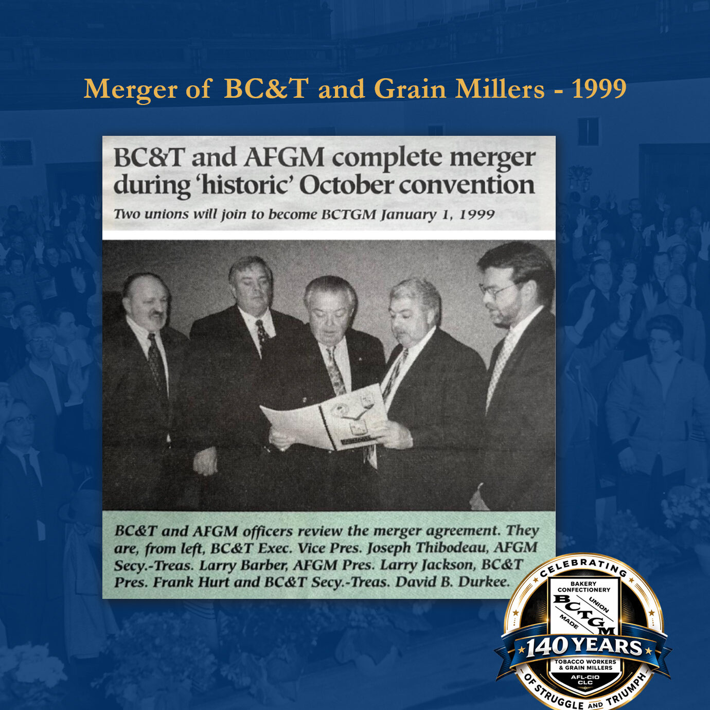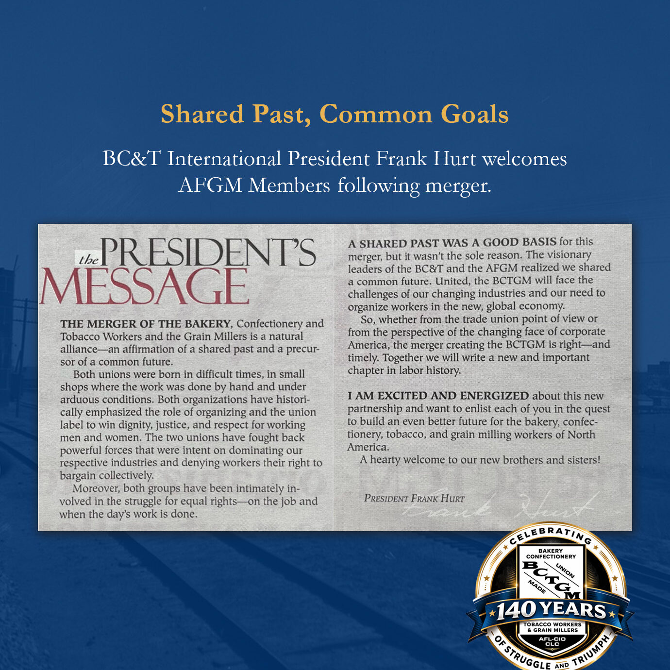 The AFGM represented workers in flour milling, animal feed production, sugar processing and grain handling until its 1999 merger with the Bakery, Confectionery & Tobacco Workers—forming what is known today as the Bakery, Confectionery, Tobacco Workers and Grain Millers International Union (BCTGM).