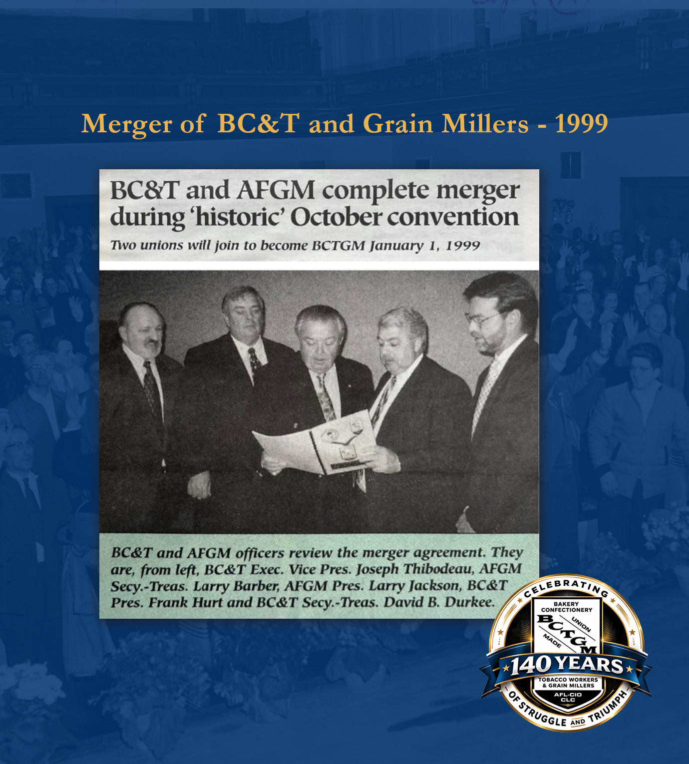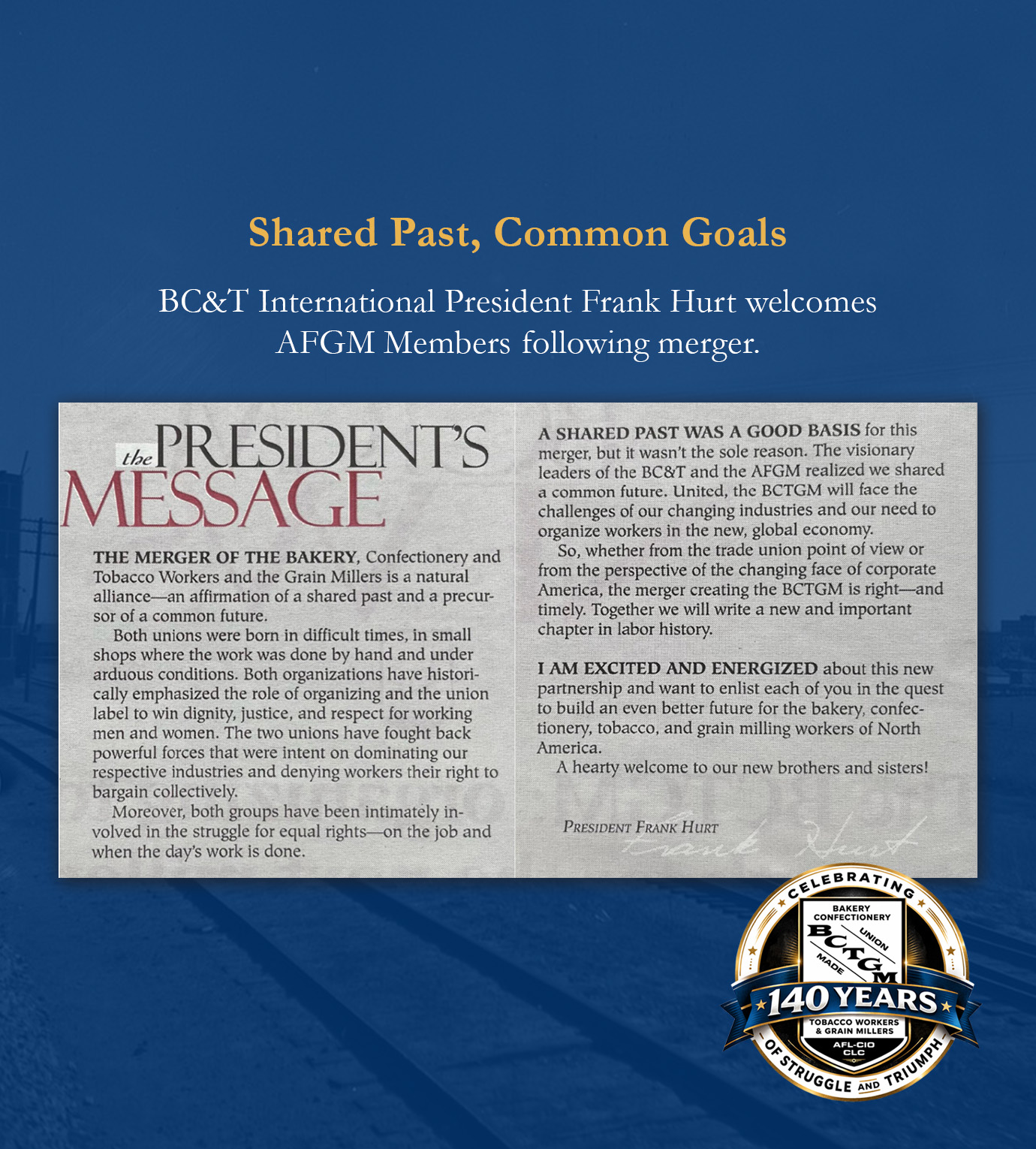 The AFGM represented workers in flour milling, animal feed production, sugar processing and grain handling until its 1999 merger with the Bakery, Confectionery & Tobacco Workers—forming what is known today as the Bakery, Confectionery, Tobacco Workers and Grain Millers International Union (BCTGM).